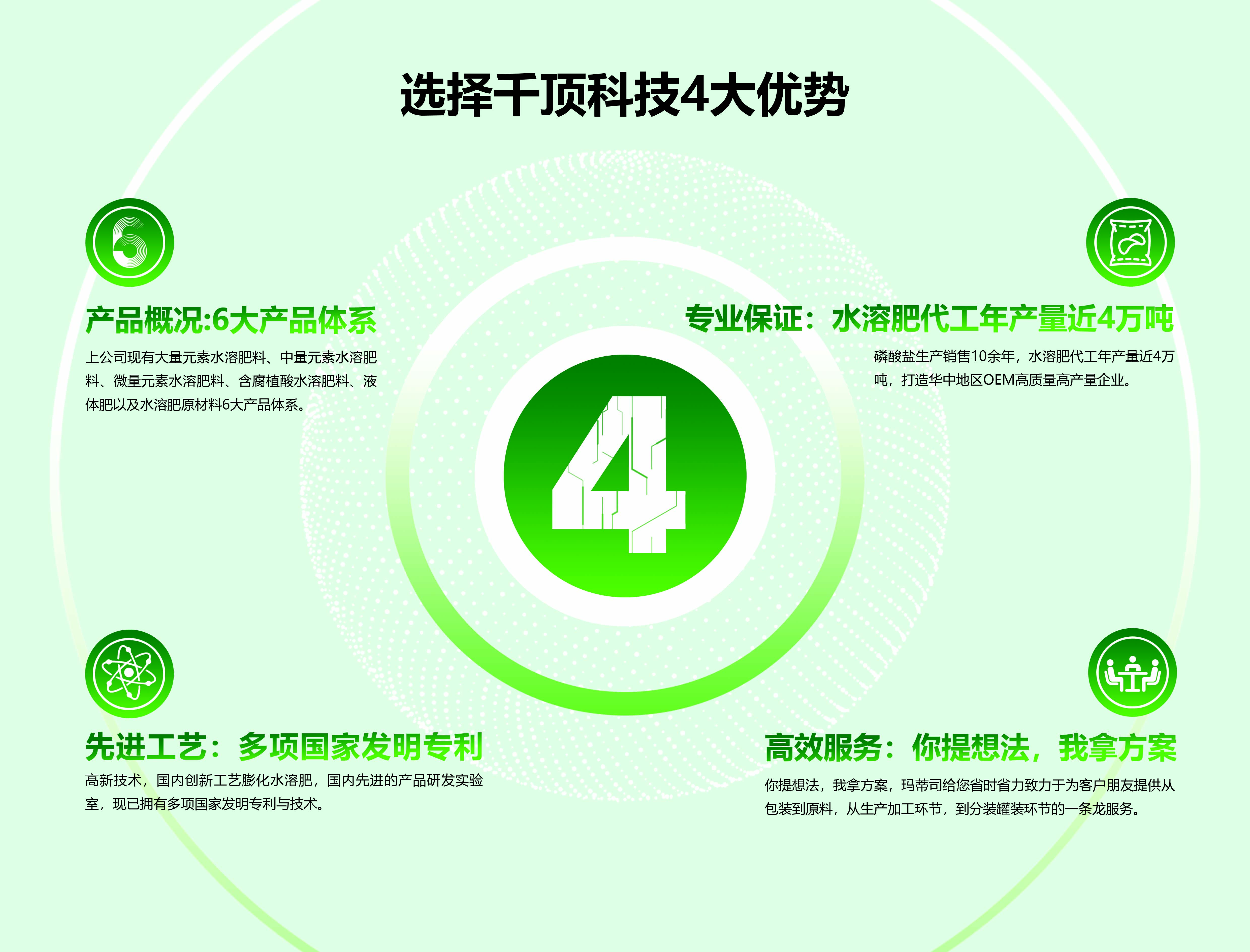 湖北千頂科技有限公司位于九省通衢,美麗的江城武漢,是一家專業從事研發(fā)、生產、磷酸鹽和高端水溶肥等一體化工企業,是一家致力于打造農業與工業攜手進步的化工企業...